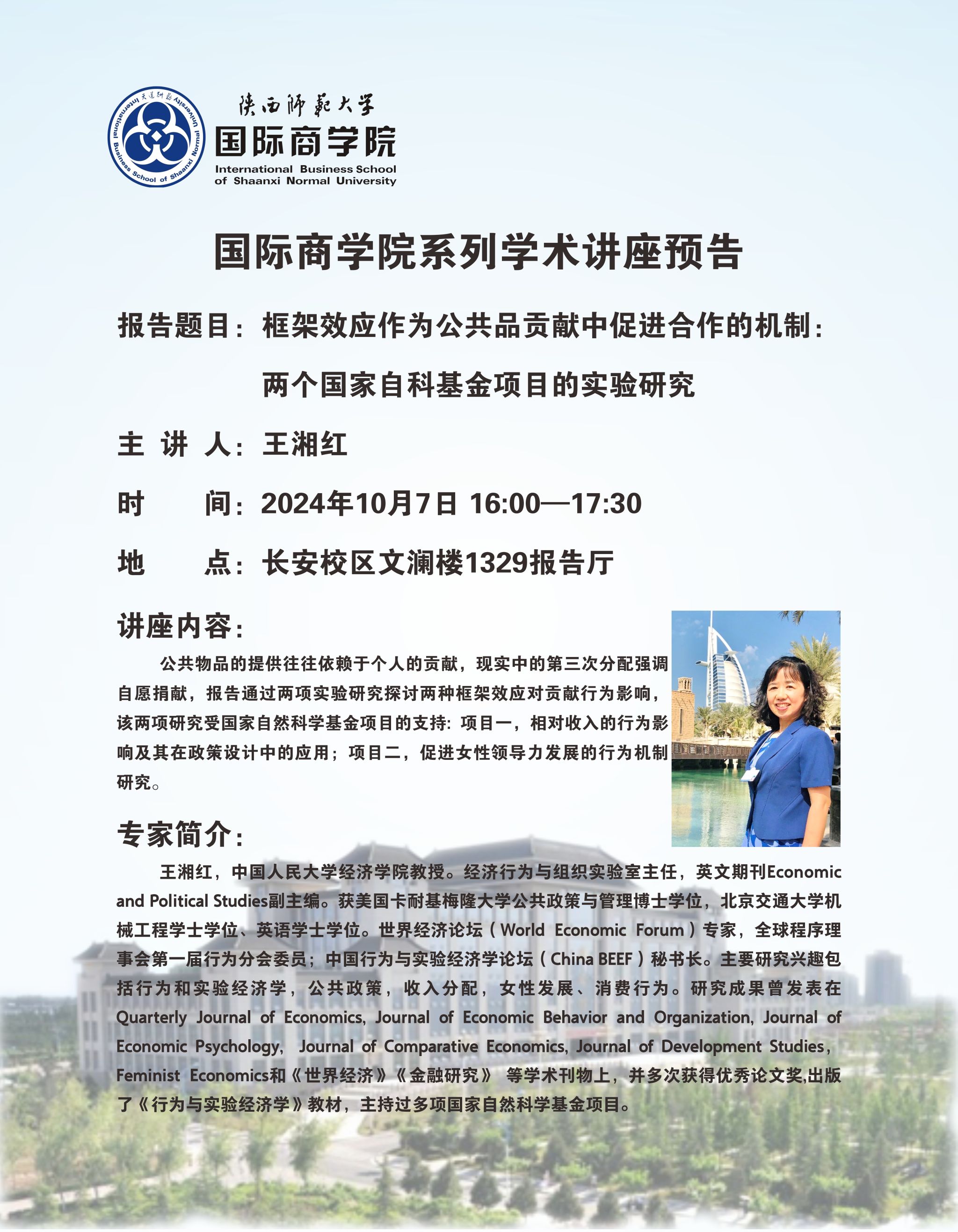 学术讲座预告——框架效应作为公共品贡献中促进合作的机制:两个国家自科基金项目的实验研究