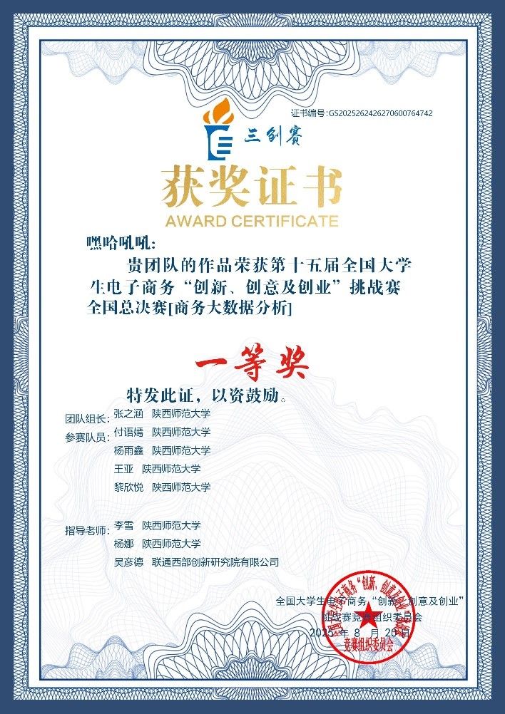 7月11至13日,备受瞩目的全国大学生电子商务“创新、创意及创业”挑战赛(简称“三创赛”)商务大数据分析实战赛全国总决赛在广州工商学院(广州校区)举行并圆满落幕。来自全国28个省、自治区、直辖市的98所高校、116支精英团队、逾600名师生齐聚广州。经过两天的紧张比拼,大赛最终评选出特等奖12项、一等奖35项、二等奖69项。我院参赛团队嘿哈吼吼队凭借扎实的专业素养、创新的项目构思与出色的现场表现,从全国众多顶尖队伍中脱颖而出,成功斩获全国一等奖,取得我校参赛历史最好成绩。该团队由我院22级大数据管理与应用专业张之涵担任队长,大数据管理与应用专业付语嫣、杨雨鑫、王亚和计算机科学专业的黎欣悦组成。她们打造的“AutoPrice”二手车智能估价系统,利用人工智能技术和机器学习实现二手车的精准定价,彰显出数据赋能产业创新的广阔前景。杨娜、李雪和企业指导教师吴彦德获优秀指导教师。