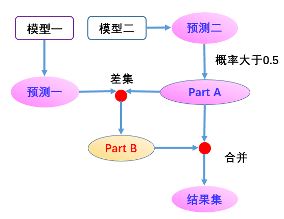 M1的优点在于适应性更强,M2则能对那些训练数据较多的店铺更好地进行拟合,从而对高热度的店铺有更高的推荐准确率。“所以最终我们决定采用模型融合”。首先利用M1进行整体预测,然后利用M2对测试数据预测,取预测用户到达店铺概率在0.5以上的那些训练记录,将其作为PartA;接下来,将PartA预测的那部分数据,从M1的整体预测集中作差集,得到PartB;最后将PartB与PartA两部分预测子集合并,得到最终的预测结果集。