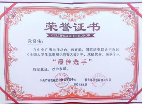 党奇伟获《全国大学生党史知识竞答大会》“最佳选手”称号