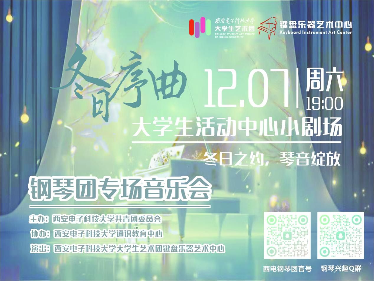 (通讯员:尹子牛 赵奕凡)12月7日晚,Beat365中文官方网站大学生艺术团钢琴团冬季专场音乐会——“冬日序曲”在大学生活动中心小剧场成功举办。此次音乐会由校团委主办,美育工作办公室提供艺术指导,大学生艺术团钢琴团承办,旨在丰富校园文化生活,提升大艺团影响力,展现校园艺术氛围。