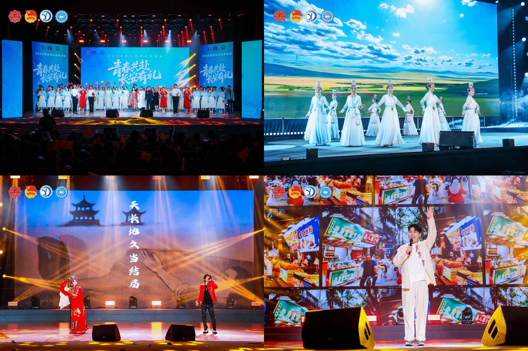 晚会现场,传统与现代精彩碰撞,开启一场跨越时空的对话。开场《大唐雅韵钟鸣鼓乐》西安外事鼓乐团以震撼鼓点穿越千年;《唐宫夜宴》大学生艺术团舞蹈团的同学们身着华丽服饰,以灵动舞姿完美融合古典韵味与现代舞台表现力;离退休教职工劲松艺术团带来的蒙古舞蹈《敬》用舒展的舞姿和深情的演绎,触动每颗心怀敬意的青春心房;《长相忆》《长安夜》秦腔传承人李梅和西安摇滚音乐人王建房合作用婉转的秦腔、澎湃的摇滚、真诚的旋律,连接起每颗向往长安的心;《西安人的歌》西安唱作人程渤智带动全场,气氛热烈引发大合唱;《西安礼遇》用不同维度的城市故事,完成最具仪式感的“入学第一课”,“孝老爱亲全国道德模范”丁水彬、西安市新文艺青年协会代表冯佳晨等城市榜样与新生共同演绎,让新生在西电开启无限可能的青春之旅。